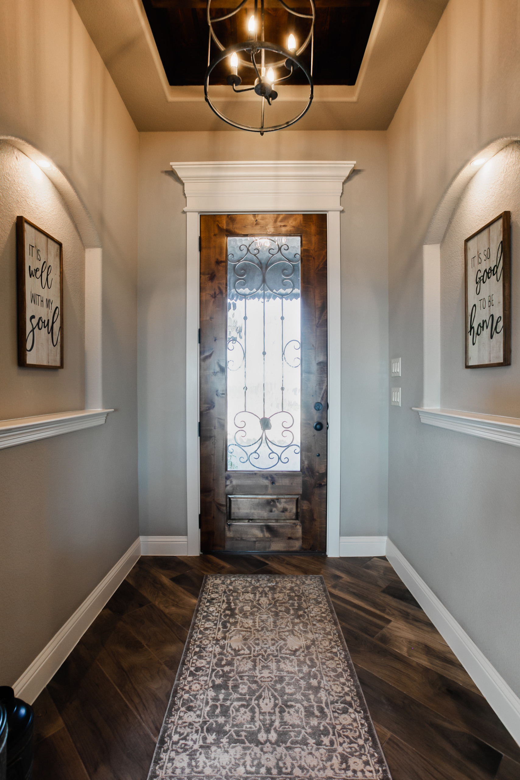 Front Entry Way And Foyer With Modern Light Fixture And Tray Ceilings Custom Home By Carriage Manor 1970s House Renovation House Entrance Foyer Design